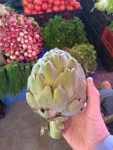 Артишок.Технология его приготовления следующая.Долго варят,пока он варится делают лимонную заправку.Выдавливается куча лимонного сока с солью.Затем поочередно отрываются листья,макаются в лимон и объедается с них мякоть,сами листья не едят.Самое вкусное и мягкое в середине.Мне не понравился.